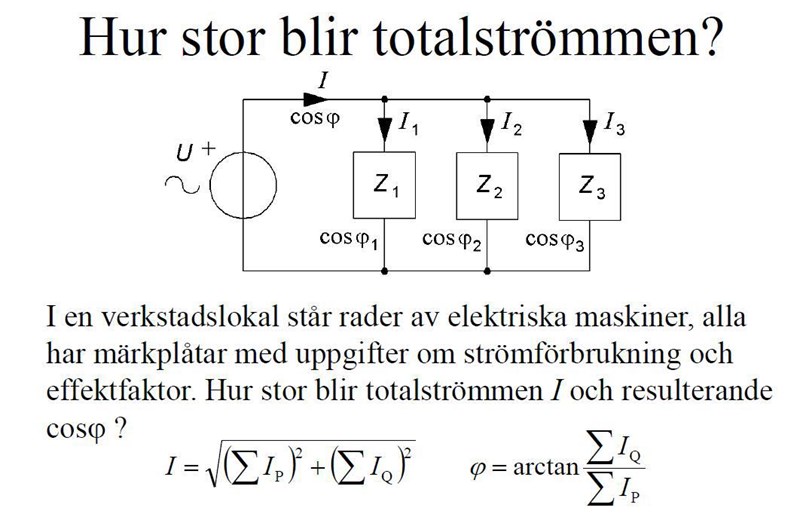 och man kommer till samma svar som ovan, men ser att de reaktiva strömkomposanterna () för sågen och belysningen är motriktade varandra, och ska därför subtraheras i vektoradditionen.