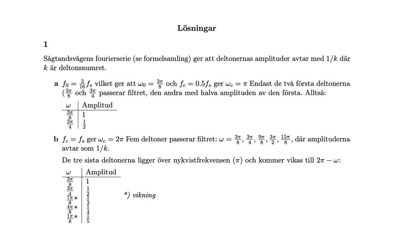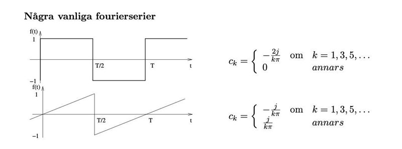 Hej, borde inte sågtandsvågens amplitud avta med 1/n^2 där n = heltal? I lösningsförslaget nedan verkar man räknat med 1/k som man gör med fyrkantsvågens amplitud. Några idéer?