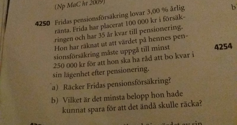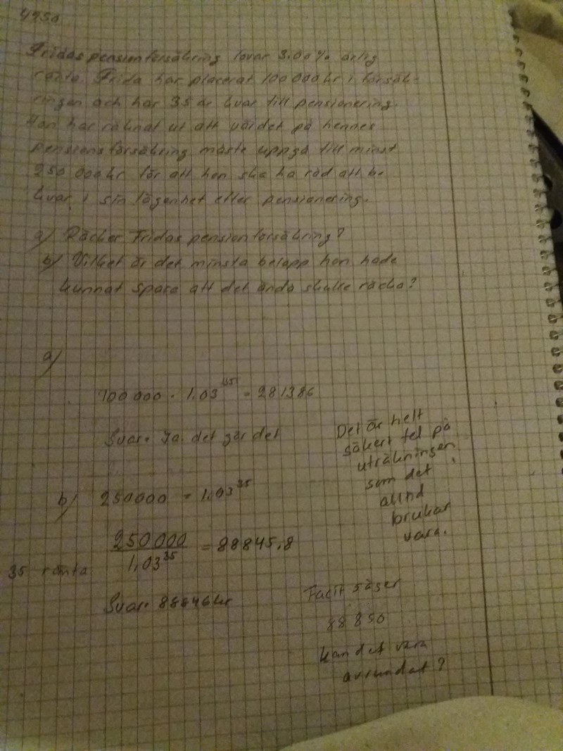 Du har fått rätt svar. En kommentar är dock att du glömt att lägga in en variabel i början: 250 0001,0335. Ekvationen du letar efter är 1,0335·x=250 000