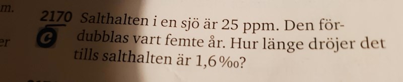 Din metod tycker jag är alldeles lysande att göra om enheterna till deciamlform ställa upp en ekvation och att lista ut att (2^x) beskriver tillväxten av salthalt.