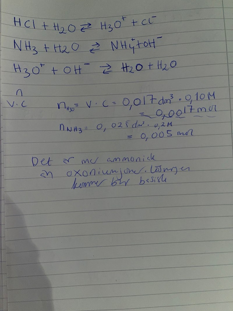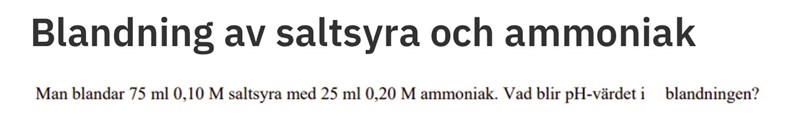 Börja med att räkna ut hur mycket oxoniumjoner och hur många mol ammoniak det är. Vilket är i överskott? Kommer blandningen att bli sur eller basisk?
