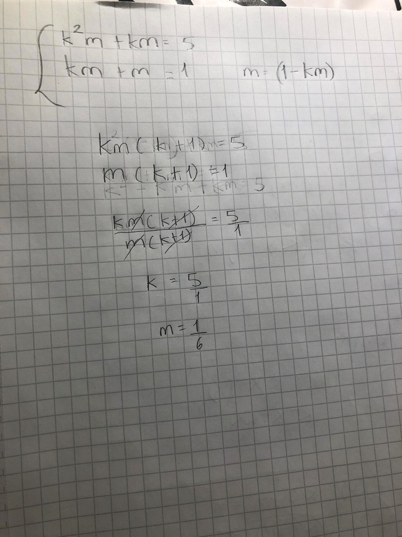 Fråga 2: Är du med på att eftersom första ekvationen säger att km+m = 1 så kan den andra ekvationen skrivas k+m = 5?