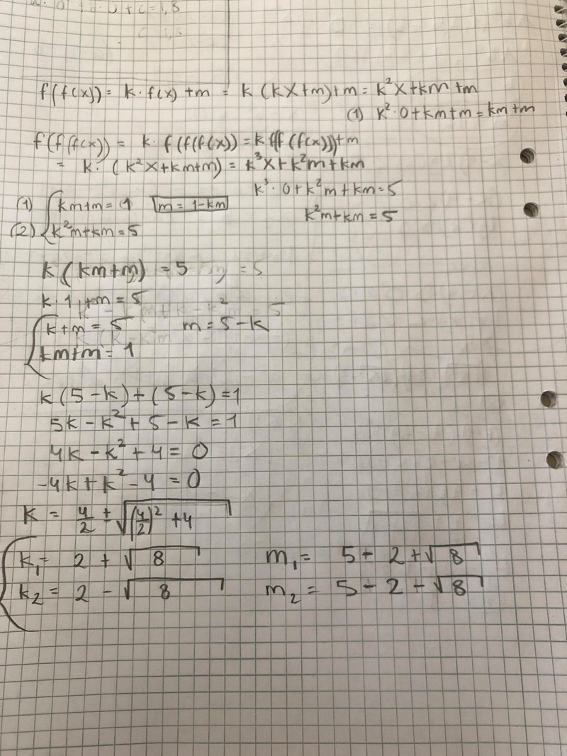 - uttrycket f(x) så får vi ut f(f(x)) = k*f(x)+m. Men eftersom f(x) = kx+m så blir f(f(x)) = k*(kx+m)+m = k^2x+km+m