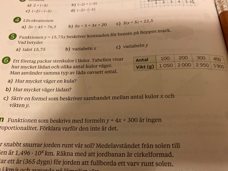 Skillnaden mellan 100 kulor + låda och 200 kulor + låda är 100 kulor och där är skillnaden i vikt 950 g. Således väger en kula 950 g / 100 = 9,5 g. Sätter vi in detta kan vi sedan få ut lådans vikt. Exempelvis: