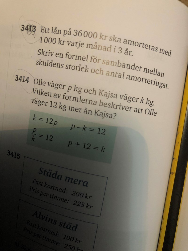 Innan jag kollade på facit skrev jag att uttrycket skulle vara 36000-1000*36=y där y är lånet och 1000kr amortering per månad. 36 stycken amorteringar.
