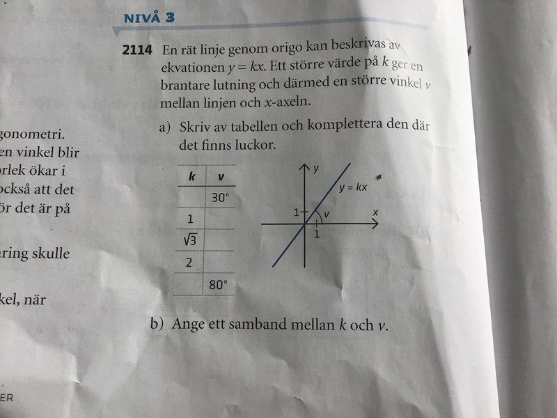 Enligt facit är sambandet Tan V= K och jag fattar ej hur de kom fram till det. Tan v är en kvot mellan rätvinkliga trianglar alltså motstående katet/närliggande katet. Hur kan tan v ge sambandet till en lutning i denna uppgift men inte sin eller cos. För att ta reda på en lutning behöver man ta förändring i y led och dividera det med förändringen X led. Återigen hur hör det ihop?