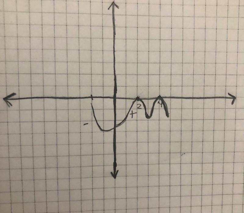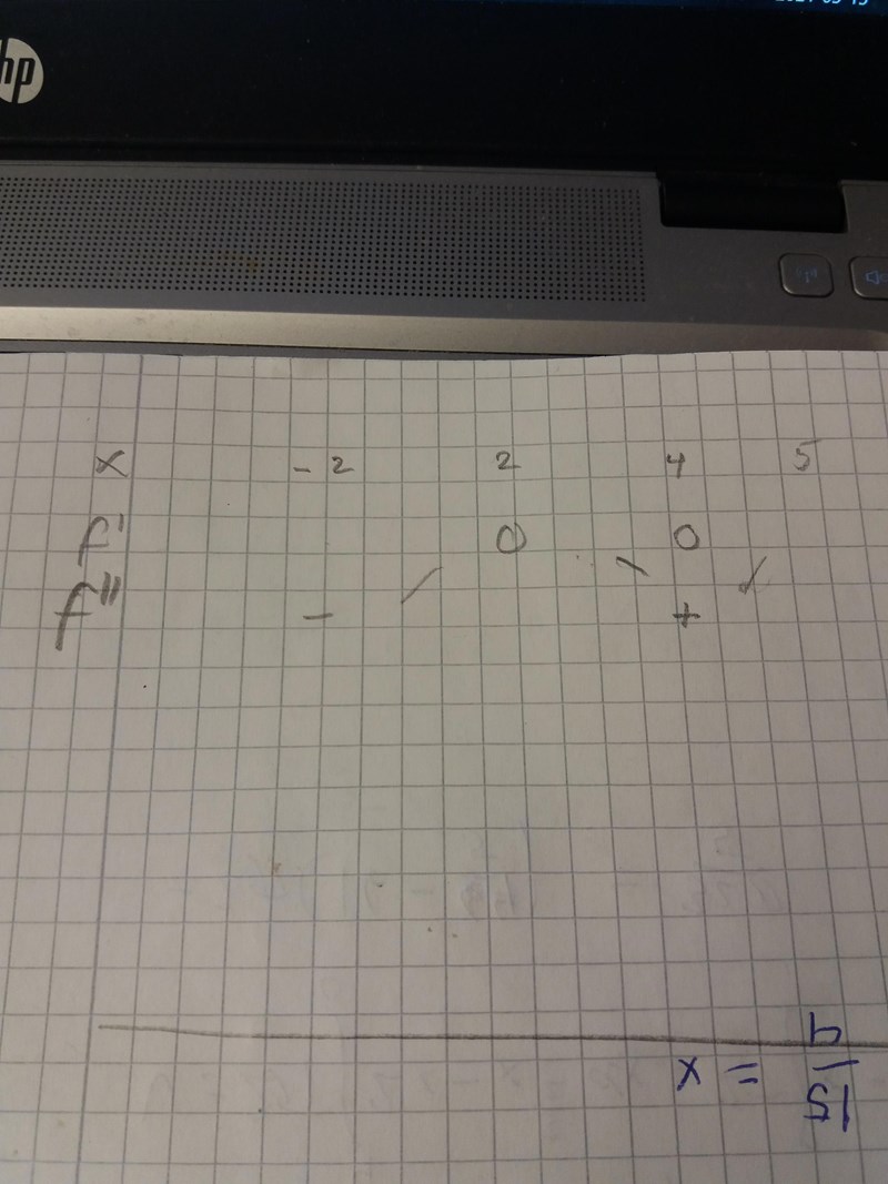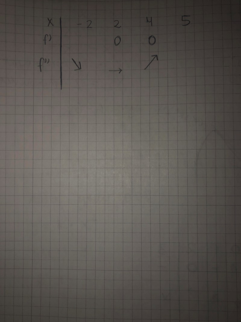 Jag förstår inte hur du skrev din teckentabell. Hur tänkte du när du skrev andraderivatan då x=-2? Hur ska man veta vad derivatan är? Derivatan är 0 då x=2 det måste betyda att andraderivatan är 0. Då x=4 är derivatan också noll, men vad är andraderivatan?