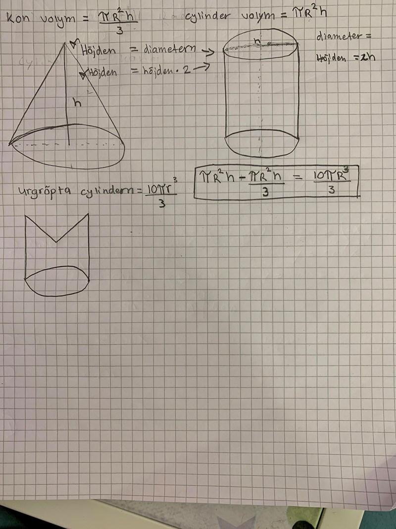 Jag förstår inte hur man bör tänka, jag har skrivit dock formeln för både cylindern och konen men kommer ingen vart.