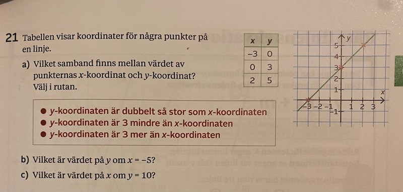 Du använder relationen från a), dvs att y = x+3, för att besvara b) och c).