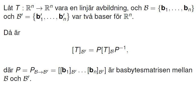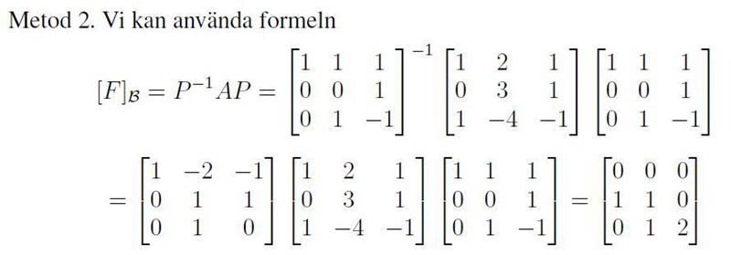 Låt standardmatrisen i första basen vara . Låt standardmatrisen i den andra basen vara . Byte ska ske från B till B´. Då gäller enligt (1): och enligt (2): . Alltså: vilken av dem är rätt?