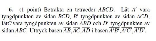 Har länge suttit och kämpat med denna, men får inte riktigt till sambandet mellan vektorerna. En tetraeder består av 4 liksidiga trianglar, och jag har beräknat höjden i en liksidig triangel till . Utifrån det kan jag konstatera att avståndet från tyngdpunkten till spetsen av triangeln är och därmed att avståndet från en tyngdpunkt till en annan är . Dock vet jag inte riktigt hur jag ska uttrycka till exempel med den informationen.