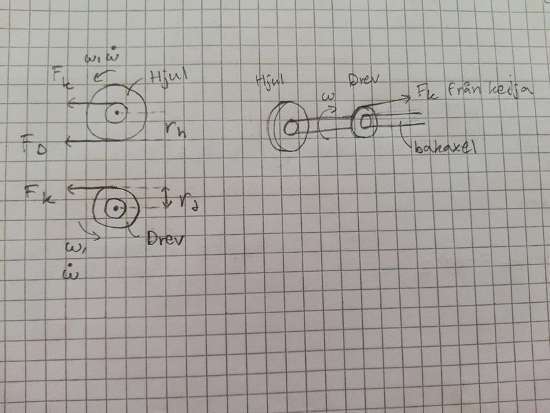 Har ett hjul och ett drev på samma axel. Drevet är kopplat till en kedja som driver fordonet framåt. Hjulet och drevet rör sig ju uppenbarligen med samma vinkelhastighet eftersom de sitter fast på samma axel, men hur kopplar jag det till drivkraften FD på hjulet och kraften från kedjan Fk på drevet? Vet att vinkelhastigheten . Går det att omvandla kraft på ett hjul till hastigheten på något sätt? (Egentligen så accelererar fordonet och då blir det ju vinkelaccelerationen men känns som att det är enklare att börja att räkna med konstant hastighet).