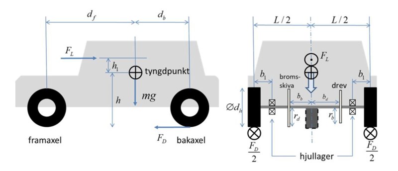 Det är en stor uppgift som handlar om att bestämma alla krafter som verkar på en kedjedriven bakaxel på ett fordon. I fallet jag analyserar nu accelererar fordonet konstant. Accelerationen (a) och avstånd mellan de olika delarna (hjul, tyngdpunkt, drev o.s.v.) är givna, resten får en definiera själv. Jag vill hitta samband mellan krafterna så att det ska gå lätt att anpassa problemet efter nya värden på acceleration, dimensioner o.s.v.. Jag vet att hjulet drivs av drevet som drivs av kedjan och försöker finna sambanden emellan dem.