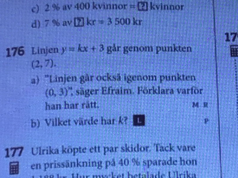 Att linjen går genom (2,7) betyder att x=2, y=7 uppfyller ekvationen. Alltså 7=k*2+3. Lös ut k så har du svaret på b och ekvationen för linjen. Kontrollera sedan om Efraim har rätt i uppg a..