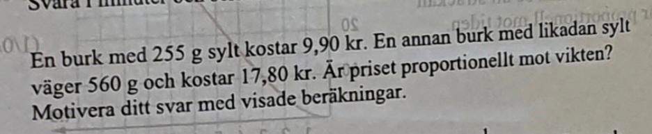 Proportionalitet skulle ge (omvandlat till vikt kg) att , och det stämmer ju inte. Kilopriset för den lilla burken blir 39 kr / kg, för den stora burken 32 kr/kg.