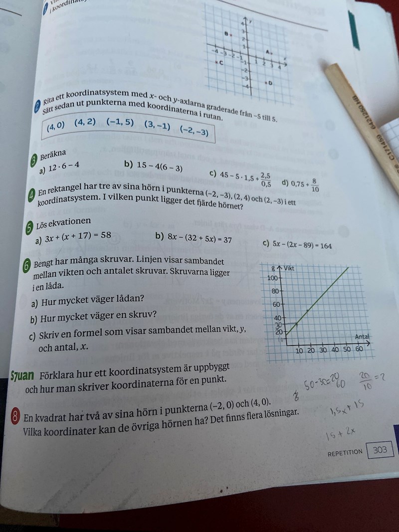 Du har dels lådan vikt l (med 0 skruvar i) och vikten per skruv s, som växer linjärt med antalet skruvar, x, så du får en formel (ekvation) y = s*x + l. Från diagrammet har du ju fått fram värden på s och l som du kan sätta in i formeln.