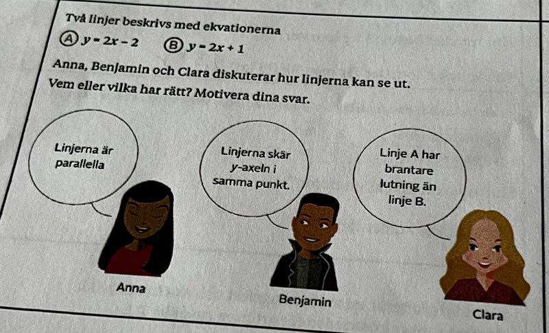Att rita som föreslogs ovan kan också vara ett sätt att lösa det. Då ska du rita båda linjerna i ett koordinatsystem för att se om de är parallella och om de skär varandra i samma punkt på yxalen och hur de lutar.