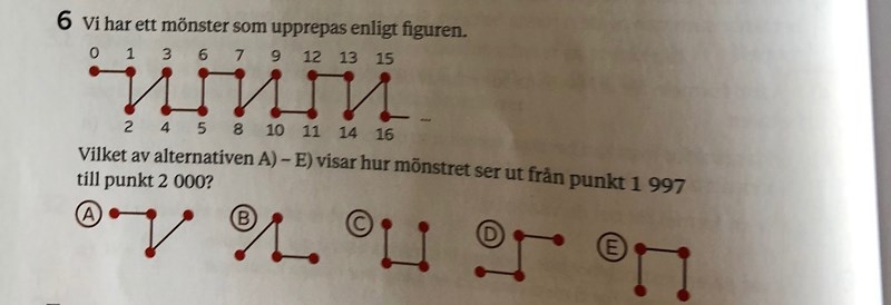 Från nod 0 till 6 är själva mönstret, därefter upprepas samma mönster. Börja med att fundera över hur många gånger detta mönstret går att göra fram till nod 2000.