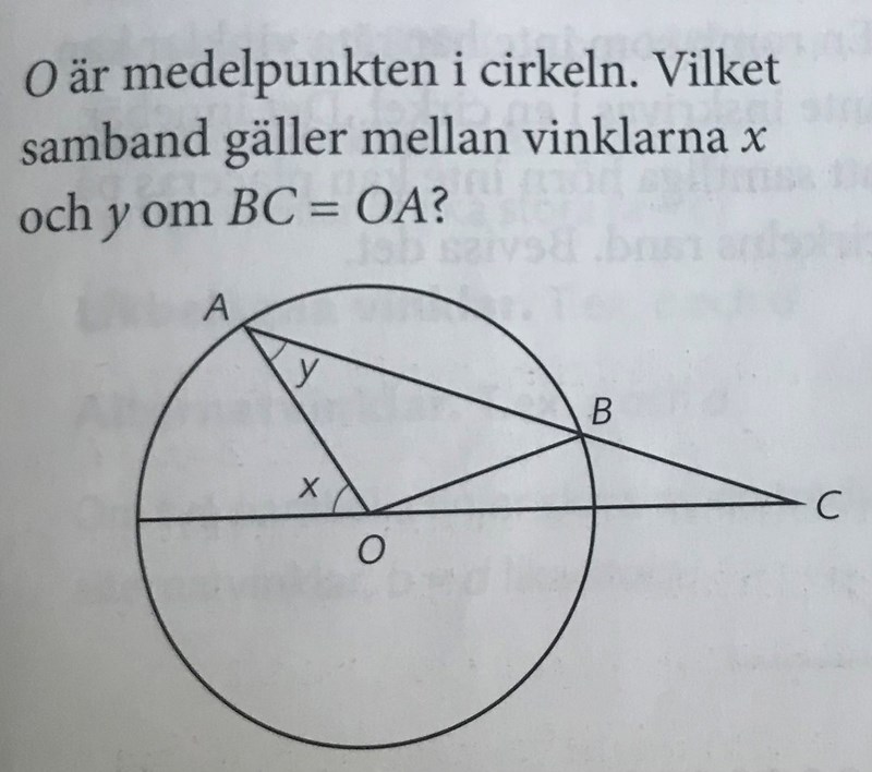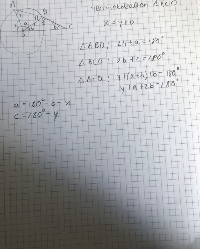 Okej men så det räcker egentligen att veta att om man använder yttervinkelsatsen för triangeln OAC så får man x=Y+b