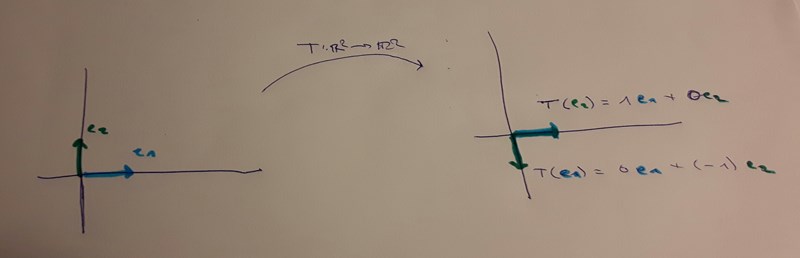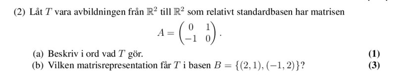 Vi låter nu vara rotation med 90 grader medurs (dvs. den linjära avbildningen i ditt exempel!). Återigen är det enkelt att beräkna matrisrepresentationen med avseende på standardbasen: