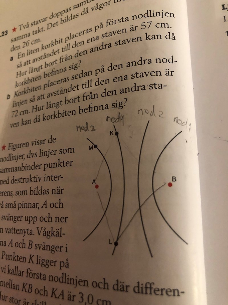 Alla punkter på nodlinjen med K och L ligger λ/2 närmare A än B.