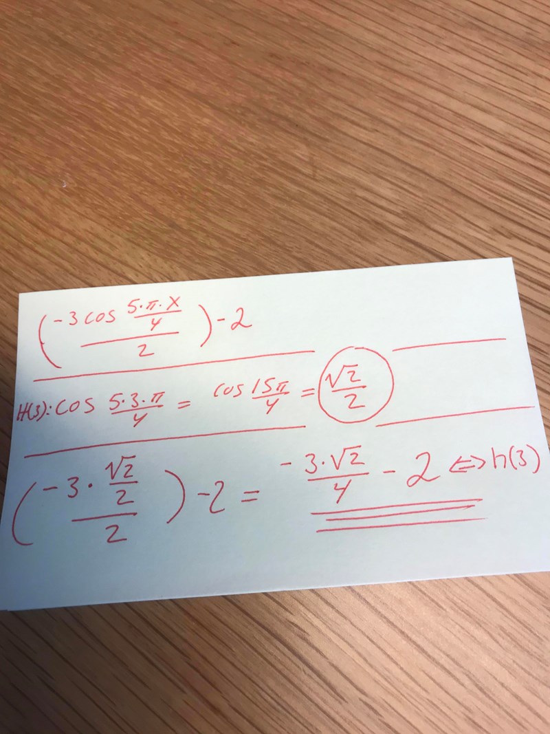 så h(x)=(((-3cos(pi*5x)/4)/2) - 2, när f(x)=(−3cos(πx)/2)−2, och g:ℝ→ℝ enligt g(x)=5x/4 ?