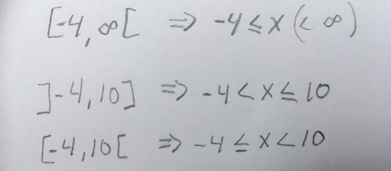 Hakparentes som pekar in mot siffran betyder att det värdet är med i mängden, och om den pekar ut från siffran är det inte med i mängden, alltså sträng olikhet. Eftersom oändligheten inte är ett tal, och alltså inte kan ingå i en definitionsmängd, så pekar den alltid utåt. Ex