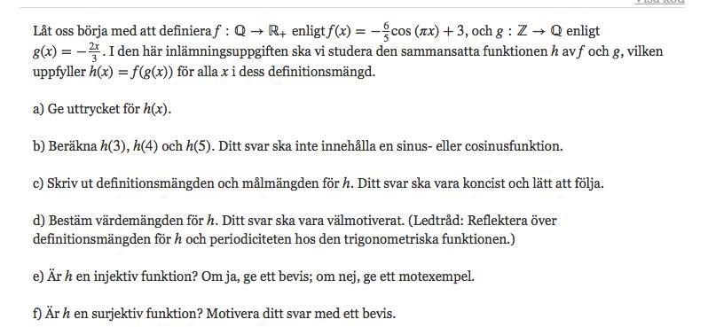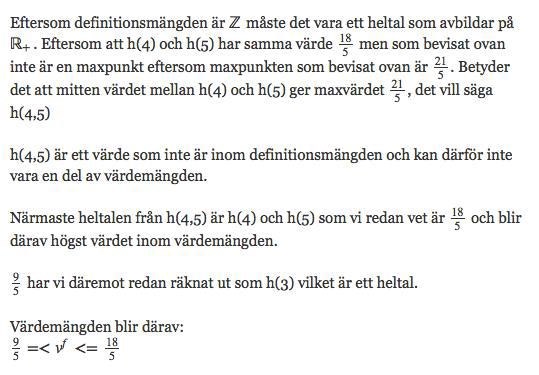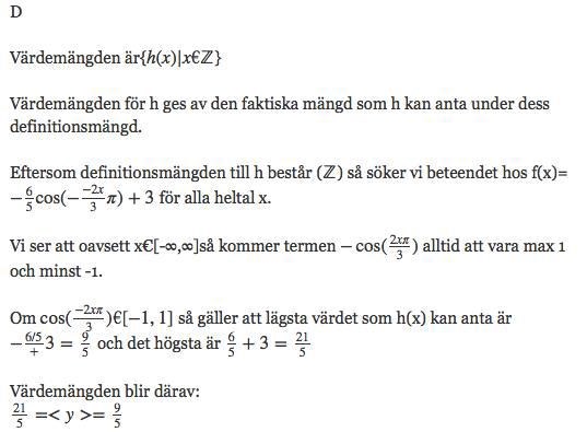 Följden av att definitionsmängden var fel när jag skicka in fick jag även fel på d uppgiften. Det jag inte riktigt förstår är om själva uträkningen och svaret är fel eller om det bara är att jag skrivit fel definitionsmängd. För hur jag än vrider och vänder på det kan jag inte se någon annan lösning än den jag skrivit.