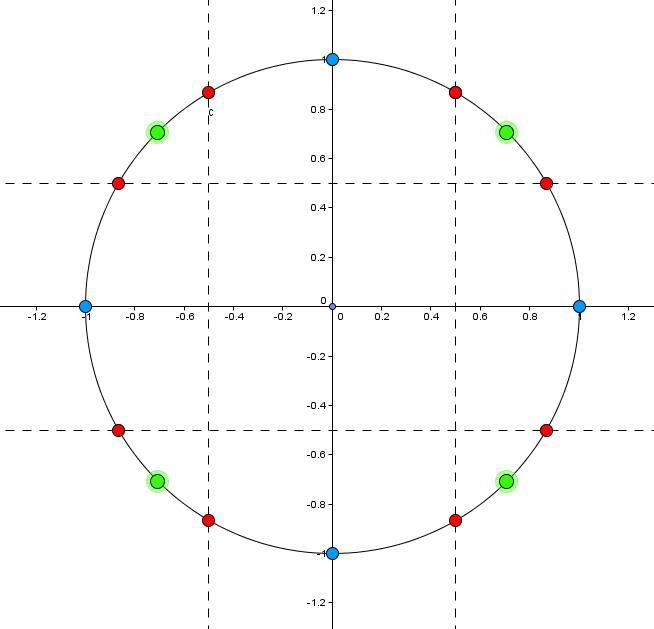 Andra serien är multiplar av 45 grader (dvs av radianer). Här finns gröna och blå punkter.