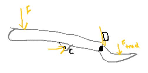Fortsätt med resten, du ser här nu att du har för många okända så du måste stycka och frilägga hela strukturen! Nästa steg kan vara nedre handtaget kopplat med A och C följt av länken AB för att avsluta med knips-delen BDE.