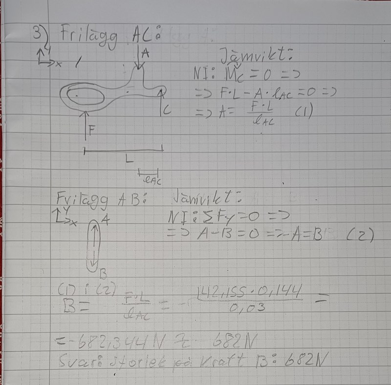 Frilägg delen som startar med handtaget och slutar i A och C och därefter delen AB. Vad blir storleken på kraften i B?