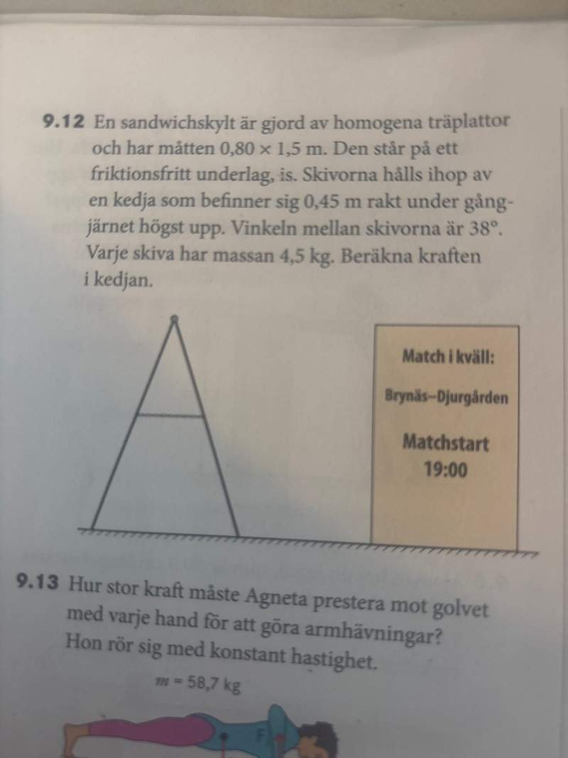 För att skylten ska stå still, alltså inte glida isär, måste det råda både kraft jämnvikt och momentjämvikt.