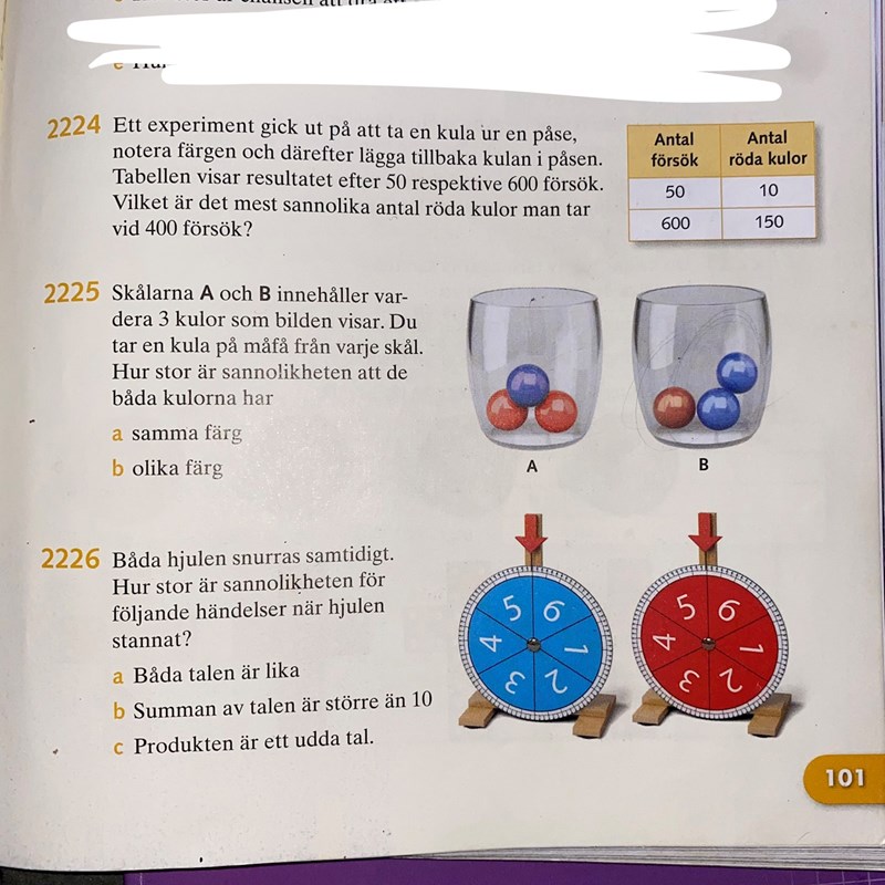 tack för att du kommenterade! (: jag vet redan att ju fler försök desto mer trovärdigt blir det. men frågan är ju vad det mest sannolika antal röda kulor man tar vid 400 försök har testat p-formeln men har inte riktigt fattat hur jag ska ställa upp för att få rätt svar. på 2225 har jag försökt med p-formeln och antingen gör jag helt fel (antagligen) eller så funkar inte den just där. och när det gäller 2226 så antar jag att det även där har med den formeln att göra. problemet är bara att jag inte vet hur jag sta ställa upp allting ):