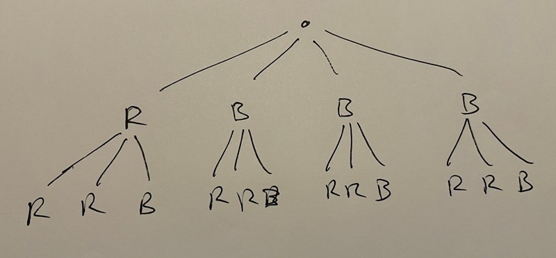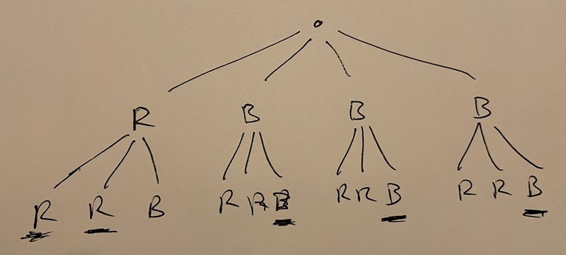 Ser du att första raden i träddiagrammet har valen "B R R"? Det är för att det finns 1 blå och 2 röda i diagrammet.