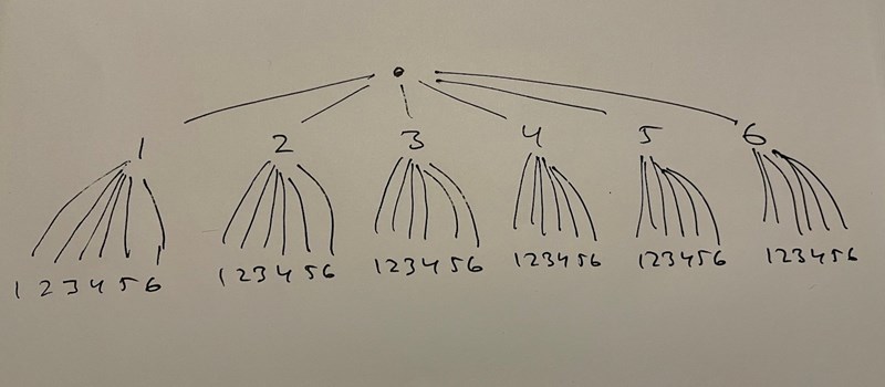 Kan du rita ett träddiagram? Det blir 6 alternativ i första valet och sen 6 nya alternativ för vart och ett av dem.