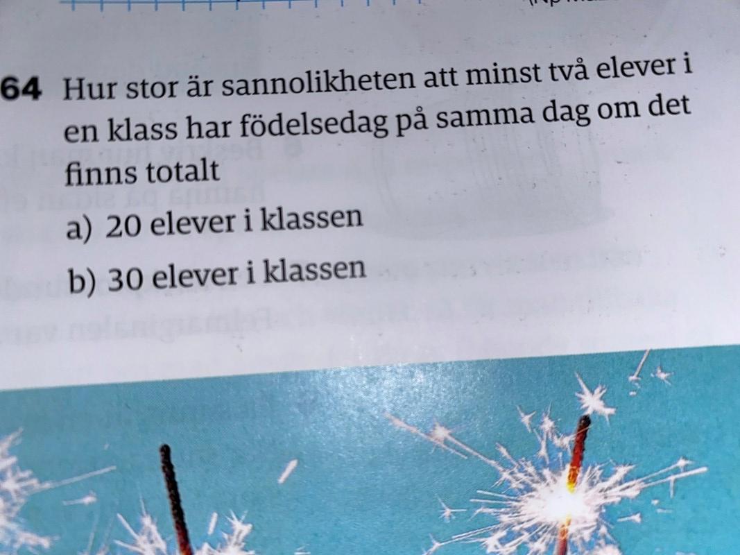 Här är det enklast att titta på komplementhändelsen, dvs inga elever har födelsedag samma dag ,