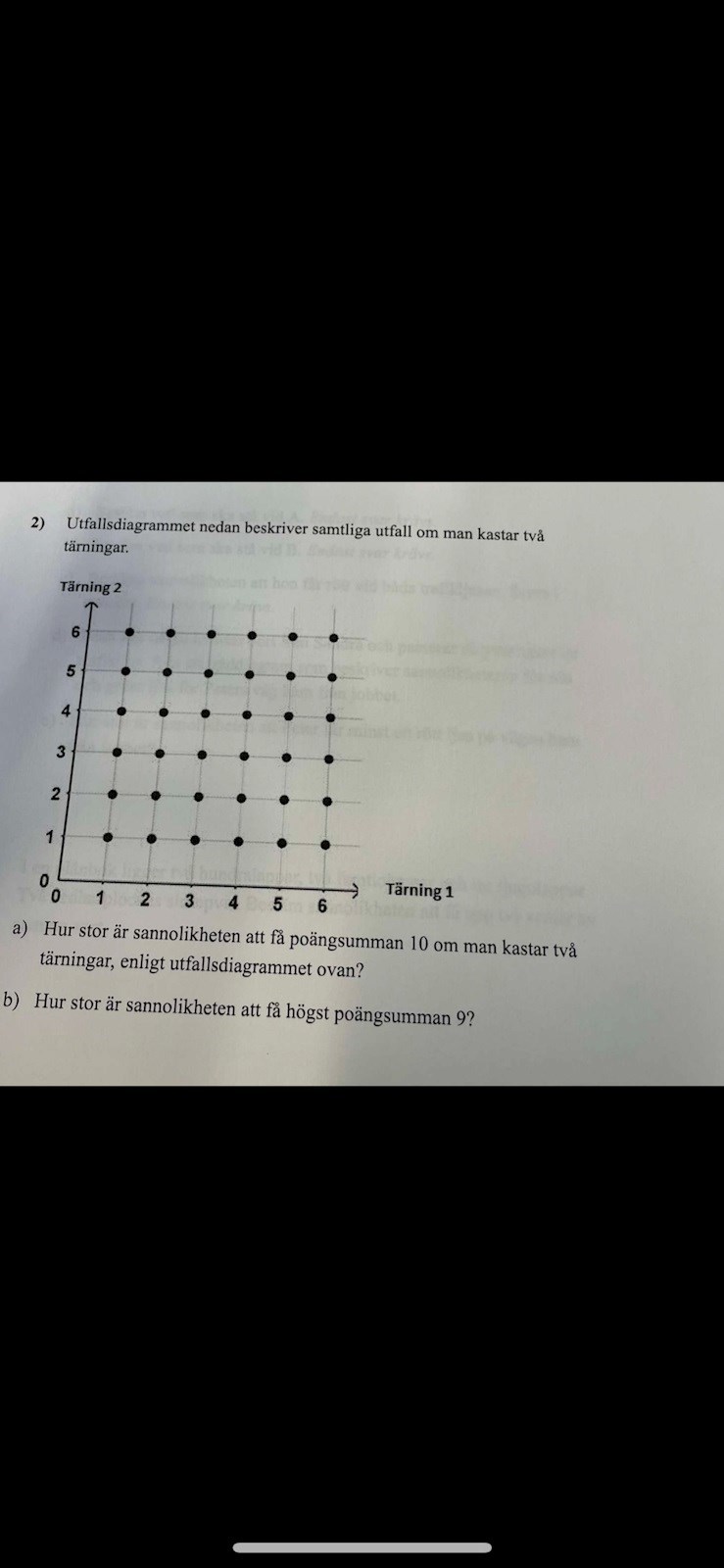 MarFri skrev:För varje punkt i diagrammet kan du se hur många poäng det var för tärning 1 och för tärning 2. Längst ned till vänster finns en punkt med poängen 1 för både tärning 1 och tärning 2. Vad är poängsumman för den punkten?