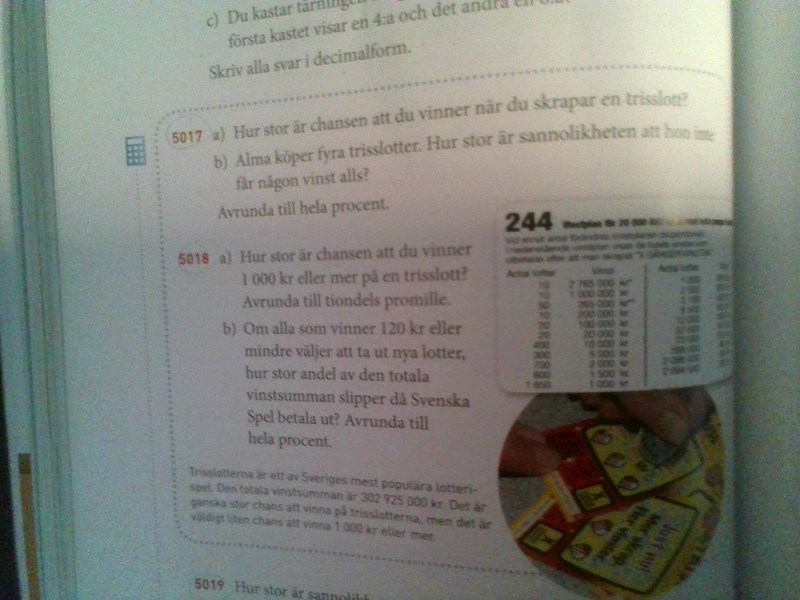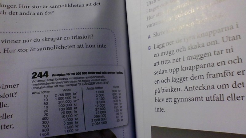 Laguna skrev:Jag ser inte riktigt vad det står, men det står väl t.ex. hur många lotter det finns som ger 1000 kr, osv. för alla slags vinster. Det står förhoppningsvis hur många som inte ger någonting också.