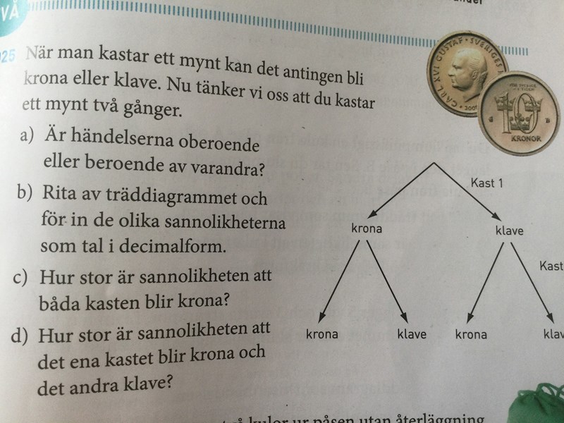 Sannolikheten för att båda av två oberoende händelser ska inträffa får du genom att multiplicera sannolikheten för respektive händelse. Vad blir då sannolikheten för att först få krona och sen få krona även i andra kastet?