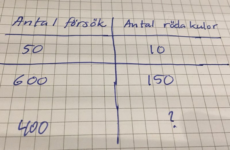 Ett experiment gick ut på att ta en kula ur en påse, notera färgen och sedan lägga tillbaka kulan i påsen. Tabellen visar resultatet efter 50 resp 600 försök. Vilket är det mest sannolika antal röda kulor man tar vid 400 försök?