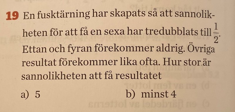 Som det står har 6 0,5 i sannolikhet. Resten (0,5) delas lika mellan 2,3 och 5. Minst är sedan sannolikheten för att få 5 och 6.