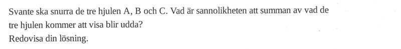 vilket ger en 1/3 eftersom att på hjul A är det 3 ( 2 udda, 1 jämn) tal och dom bestämmer om summan är udda eller jämn