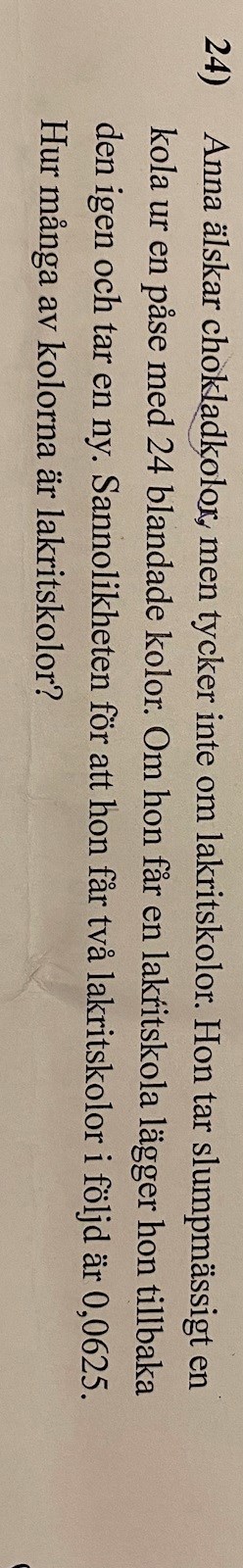 Skriv ett uttryck för sannolikheten att ta två laktritskolir i rad, sätt detta uttryck lika med 0,0625 och lös ut x.