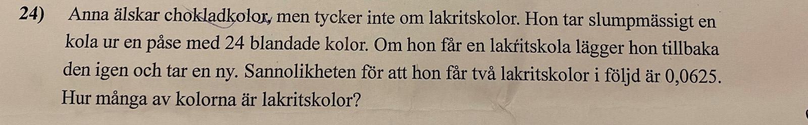 Micimacko skrev:Om vi har L st lakritskolor så är sannolikheten L/24 att få en sån första gången. Vad är sannolikheten att få 2 på rad då?