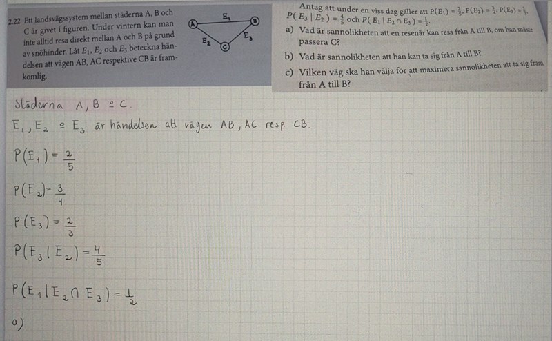 Undrar över en annan sak också, så den långa sannolikheten som blir 1/2, betyder det att "vad är sannolikheten att E1 (A till B) inträffar om E2 och E3 inträffar tillsammans..."?