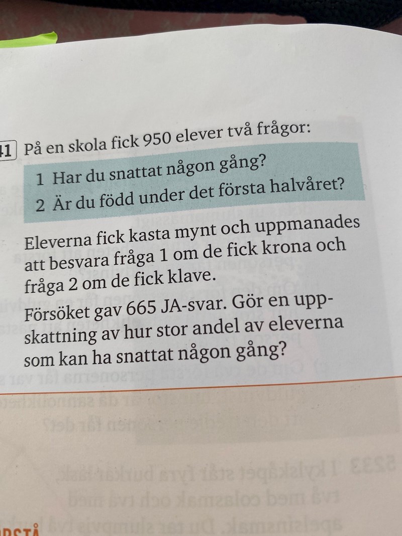 mrpotatohead skrev:Okej så min lösning var fel. De antog att sannolikheten att födas under det första halvåret är 50%.