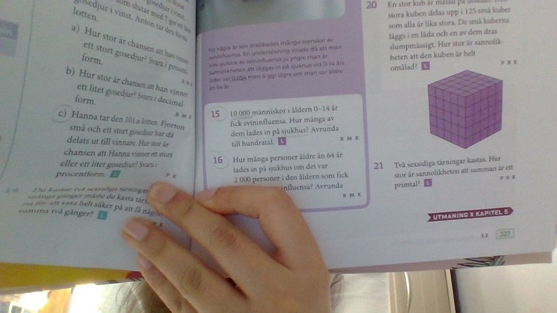 jag kan skriva det "För några år sen drabbades många svenskar av svininfluensa. En undersökning visade då att man blev sjukare av svininfluensan ju yngre man är. sannolikheten att läggas i sjukhus vid 0-14 års åldern var 0,054 men 6 ggr lägre om man var äldre en 64år."