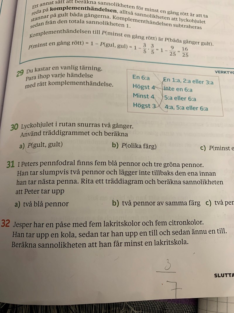 Men på andra raden försvinner det en lakritskola och blir då 4/9, men det försvinner inte någon citronkola så där ska det stå 5/9