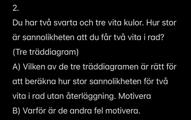 Yngve skrev:Hej. Jag antar att det finns en bild till uppgiften och att bilden visar tre träddiagram. Lägg gärna upp den bilden så hjälper vi dig vidare.
