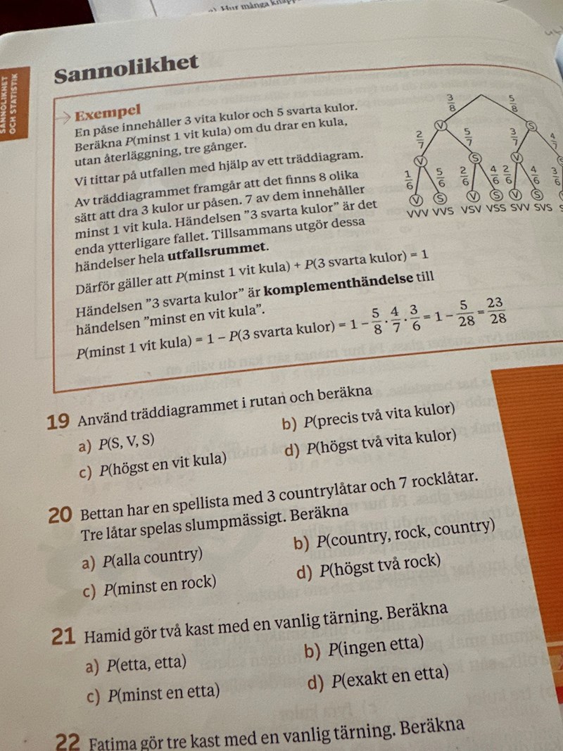 På uppgift d så vill man ha högst två vita kulor, alltså antingen 0 vita, 1 vit, 2 vita kulor. Det blir lite jobbigt att räkna ut alla dessa för sig (även om vi skulle kunna). Det enda som inte får ske är att vi får tre vita kulor(alltså att alla är vita).